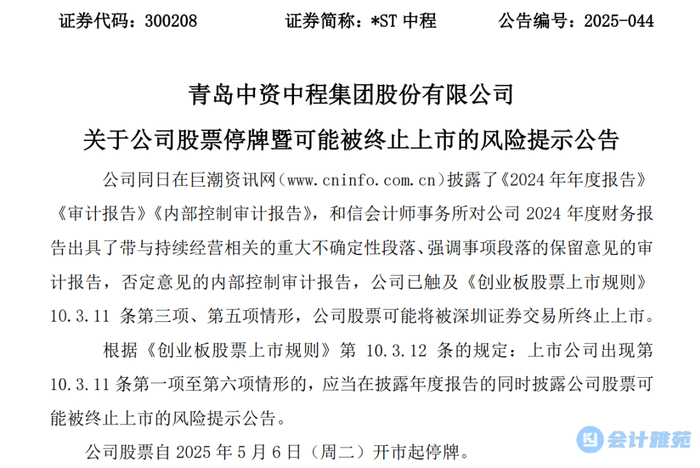 我们提醒财务报表使用者关注,如财务报表附注三、2 所述,公司 2024 年度营业收入较 2023 年度下降约人民币 3.22 亿元, 2024 年度合并净亏损为人民币 3.20 亿元,期末归属于母公司的所有者权益 1.73 亿元。截至 2024 年 12 月 31日,公司流动负债超出流动资产为人民币 7.55 亿元;流动负债中包括的短期借款、应付账款及非金融机构借款余额共计人民币 22.74 亿元。截至 2024 年 12 月 31 日的现金及现金等价物余额仅为人民币 0.69 亿元。上述事项连同财务报表附注三、2 所述的其他事项,表明存在可能导致对青岛中程持续经营能力重大疑虑的重大不确定性。 本事项不影响已发表的审计意见。