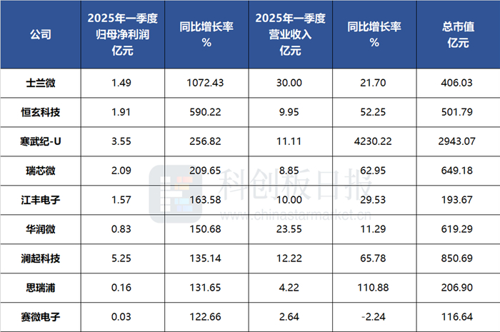 至于占据净利润增速榜第一的士兰微,则显得没那么“AI+”。作为功率半导体巨头,士兰微一季度扭亏为盈,其表示,年初以来面对国家政策拉动、芯片国产化进程加快的有利时机,公司持续加大对大型白电、通讯、工业、新能源、汽车等市场的拓展力度,同时规模优势显现,产品综合毛利率明显回升。