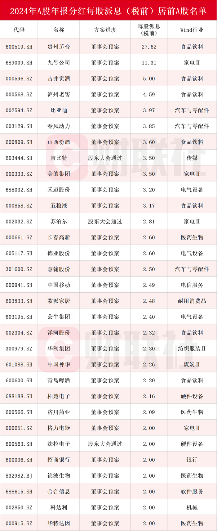 A股再迎分红潮 2024年报分红每股派息居前个股名单一览