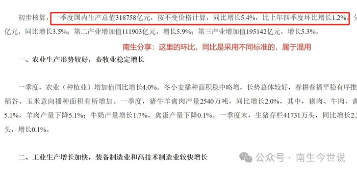 因为,我们提到各季度的经济环比数值是“都是默认采用季调标准的”,同比则是未季调标准。以2025年第一季度为例,国家统计局公布为:国内生产总值318758亿元,按不变价格计算,同比增长5.4%,比上年四季度环比增长1.2%。