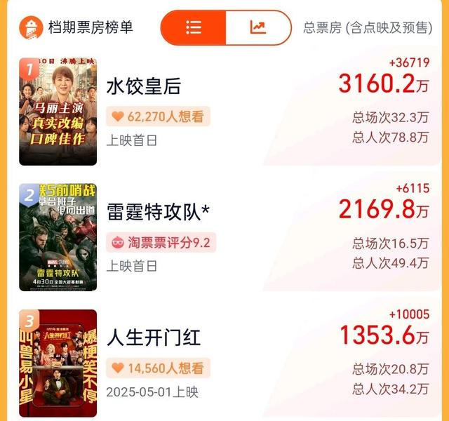 【环球网消费综合报道】5月1日消息,据灯塔专业版最新数据,截至4月30日22时05分,2025年五一档新片(含重映)总票房(含点映及预售)已成功突破1亿元大关。其中,《水饺皇后》《雷霆特攻队*》《人生开门红》《猎金·游戏》《幽灵公主》《苍茫的天涯是我的爱》等影片暂列票房前六。