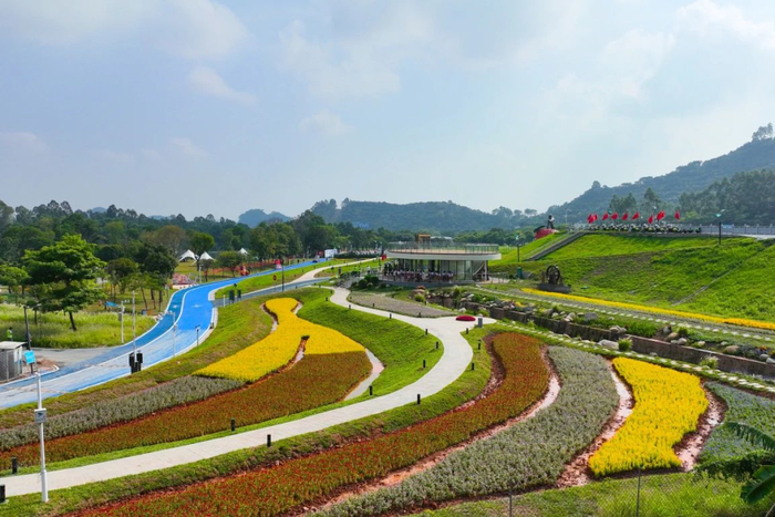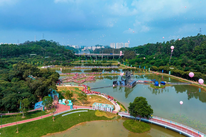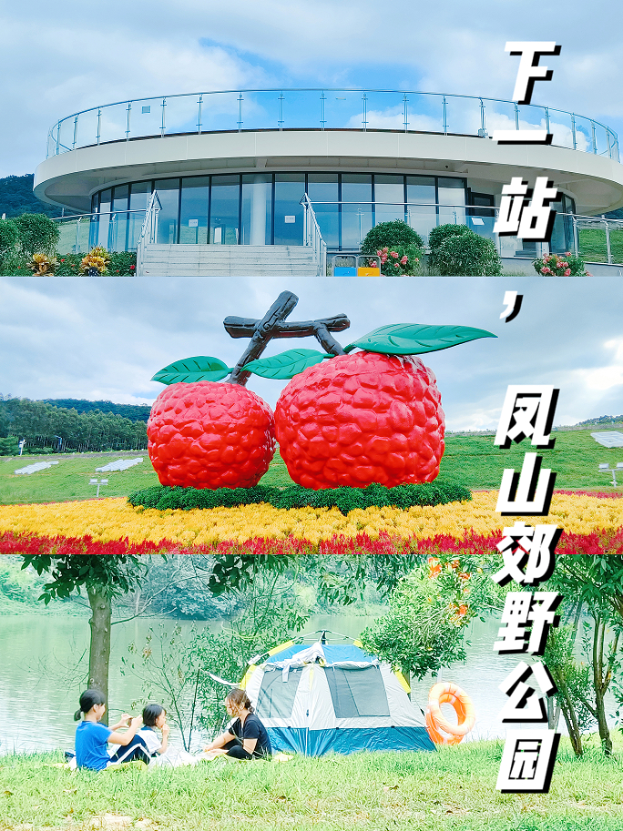 最后一站,来到大朗凤山郊野公园。公园环山而建、满眼皆绿,集合了露营、亲子乐园、赏花、钓鱼、书吧等多个游玩项目,城市生活与绿水青山在此和谐相融。