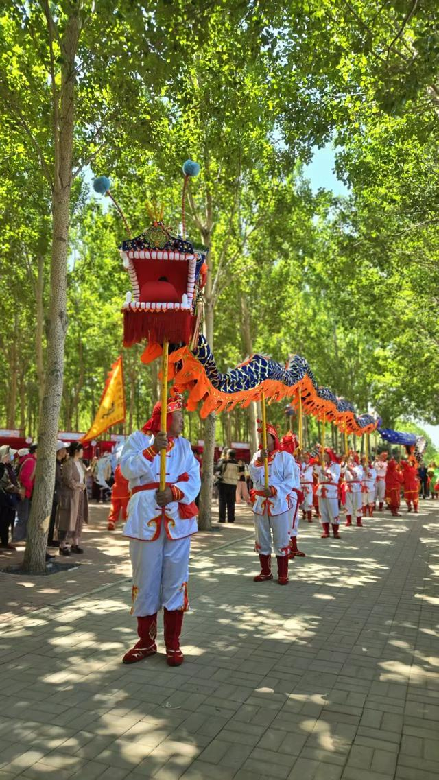 运河牡丹园,狭长的步道上,舞龙队奋力起舞。