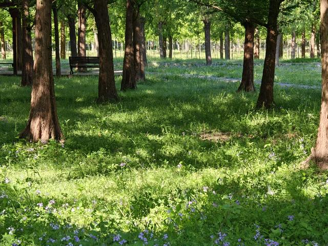运河边的公园里,阳光透过枝叶洒落,在草地上绘出斑驳光影,满是自然的闲适与惬意。