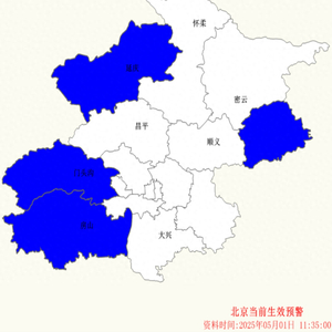 美中不足的是今天风力较明显,有六级左右的偏北阵风,平谷区、延庆区、门头沟区、房山区仍处于大风蓝色预警中。