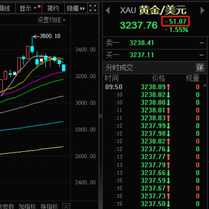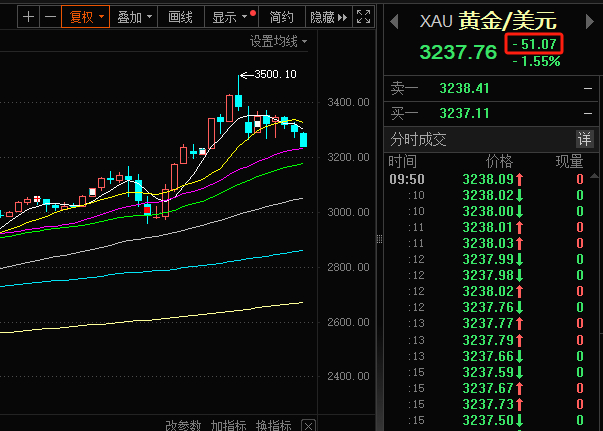 现货黄金日内大跌超50美元,现报3237.76美元/盎司,跌幅1.55%。