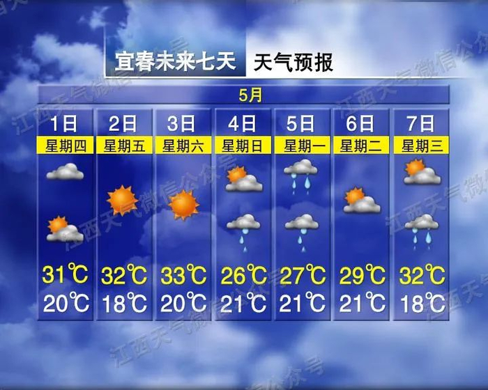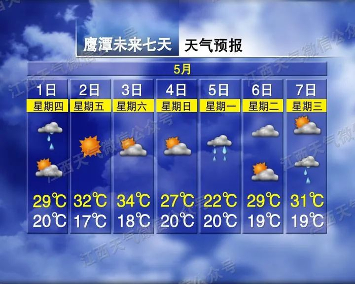 预计“五一”假期,江西天气前晴后雨。5月1~3日,全省大部为晴到多云天气,最高气温可达31~33°C,局部地区34°C。5月4~5日有降水,其中5月4日中南部有雷雨,5月5日全省自北向南,可有一次降水天气过程,局部地区有大到暴雨和雷电、短时强降水等对流天气,最高气温大部地区为26~29°C。
