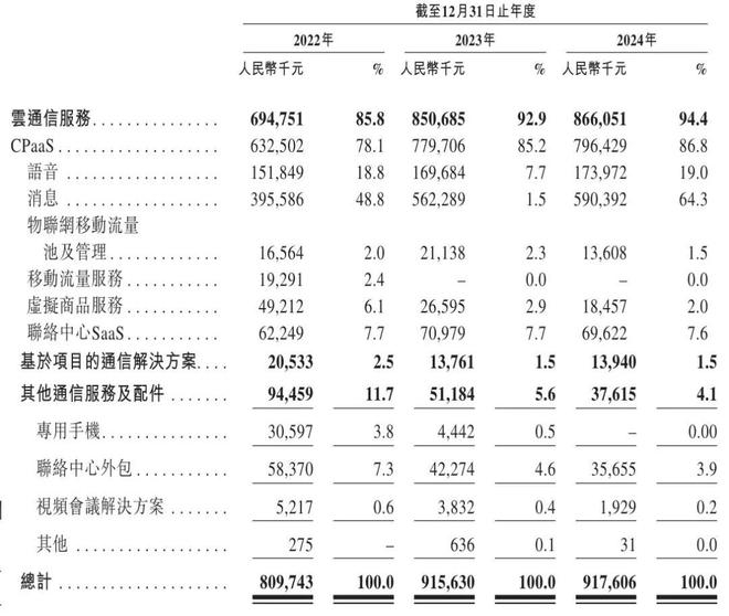 讯众通信2024年来自CPaaS的收入为7.96亿元,占营收的比例为86.8%,基于项目的通信解决方案收入为1394万元,占比为1.5%,其他通信服务及配件收入为3762万元,占比为4.1%。