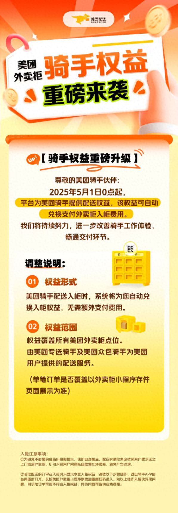 美团宣布2025年5月起全面免除骑手外卖柜使用费