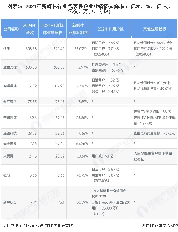 从新媒体代表企业的业绩情况来看,快手、蓝色光标等新媒体业务收入规模较大,2024年上半年,快手和蓝色光标新媒体业务收入分别为520.42亿元、308.58亿元。从业务毛利率来看,企业间新媒体业务毛利率差别较大,微博新媒体业务毛利率最高,2024年上半年达到78.75%,蓝色光标新媒体业务毛利率则较低,2024年上半年不足3%。