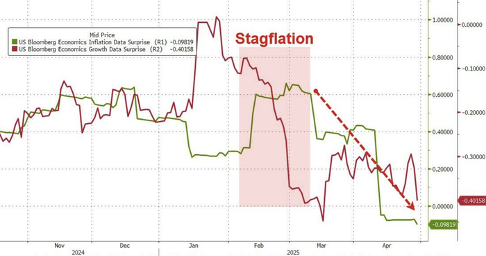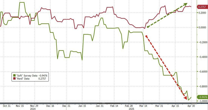 首先是美国经济数据的“软硬分化“。ZeroHedge指出,从宏观角度看,虽然4月的经济数据总体上让市场感到失望,但真正的故事是强劲的“硬数据“与崩溃的“软数据“之间的巨大分歧。
