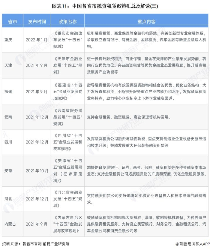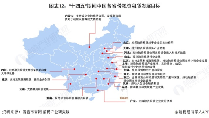 “十四五”期间,我国主要省份也提出了融资租赁行业的发展目标,包括推动融资租赁做好实体经济的支持作用,加快融资租赁创新发展等: