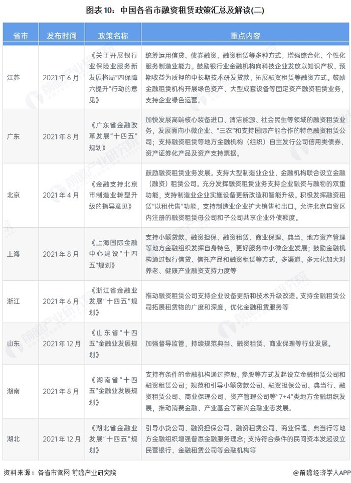 目前,多个省市包括江苏、浙江、山东、广东、上海、北京等,在“十四五”时期发布了融资租赁相关政策,明确了发展目标等内容,主要内容如下: