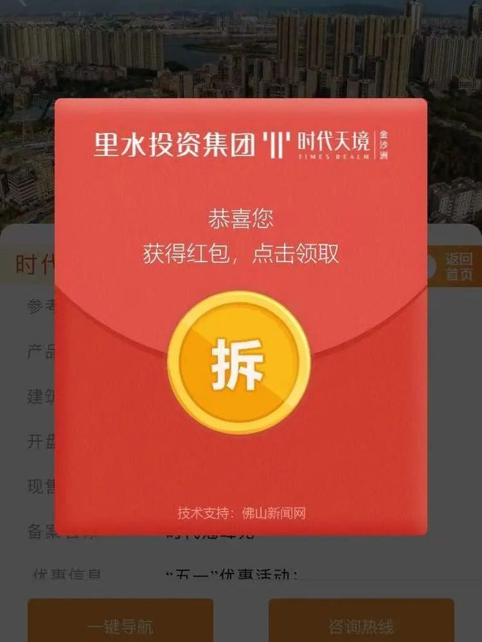 2️⃣5月1日(周四)16:00起,进入“购房易”页面,点击“时代天境2期”,浏览信息后将弹出红包页面。