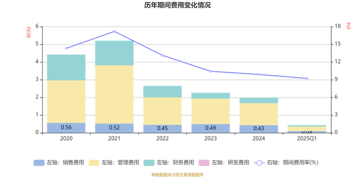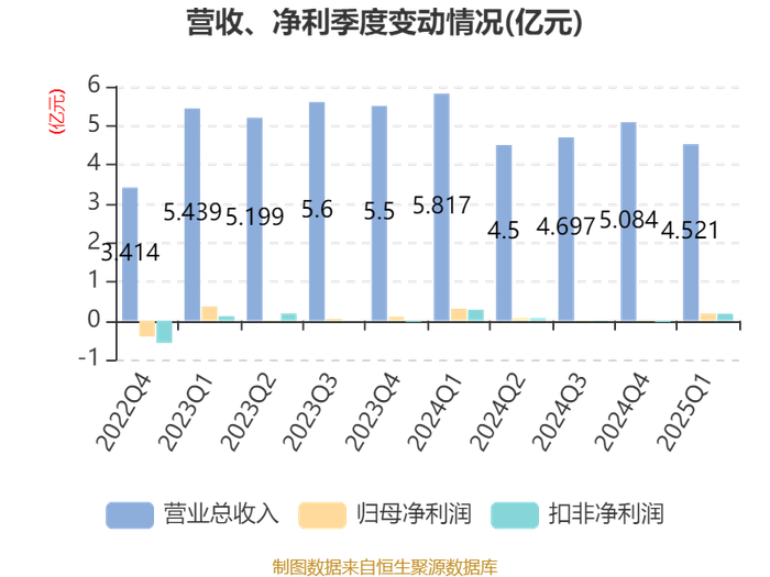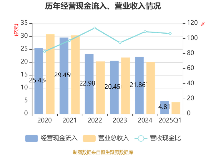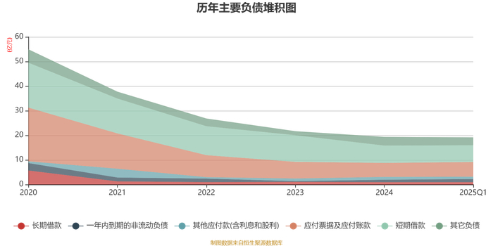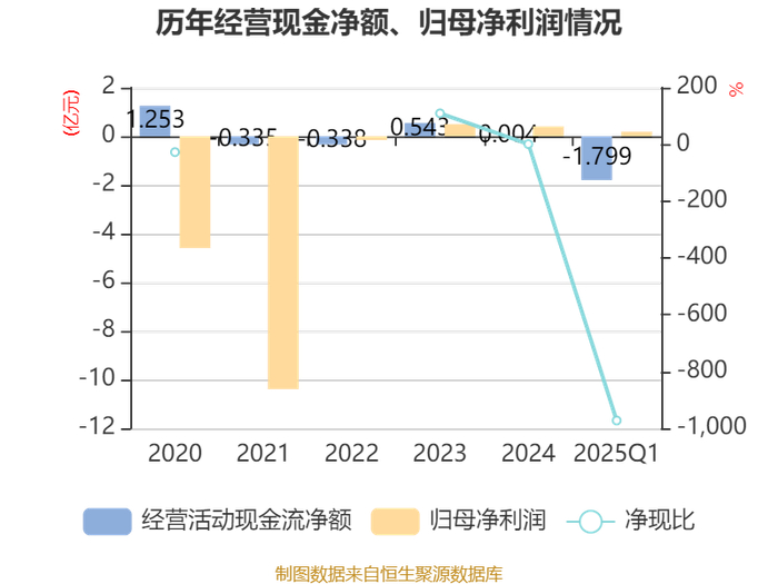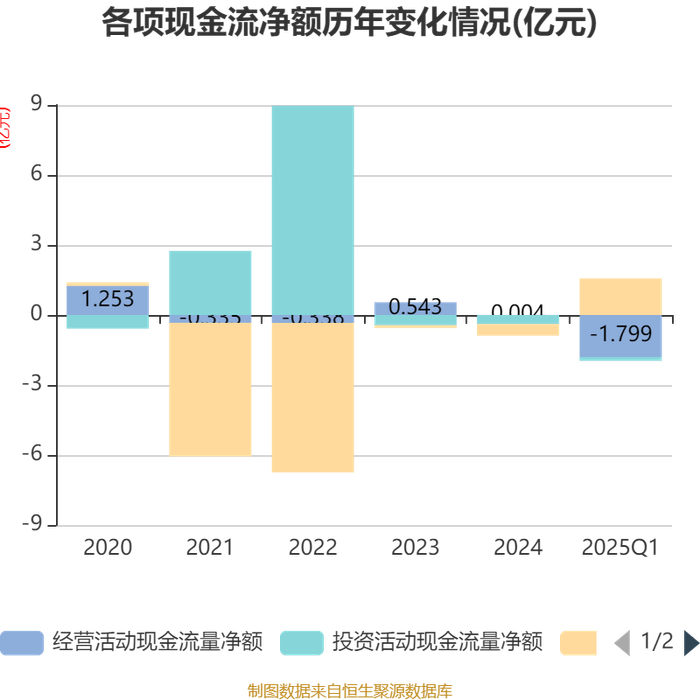截至2025年一季度末,公司经营活动现金流净额为-1.8亿元,同比增加3207.51万元;筹资活动现金流净额1.56亿元,同比减少1.36亿元;投资活动现金流净额-1626.6万元,上年同期为-1578.79万元。