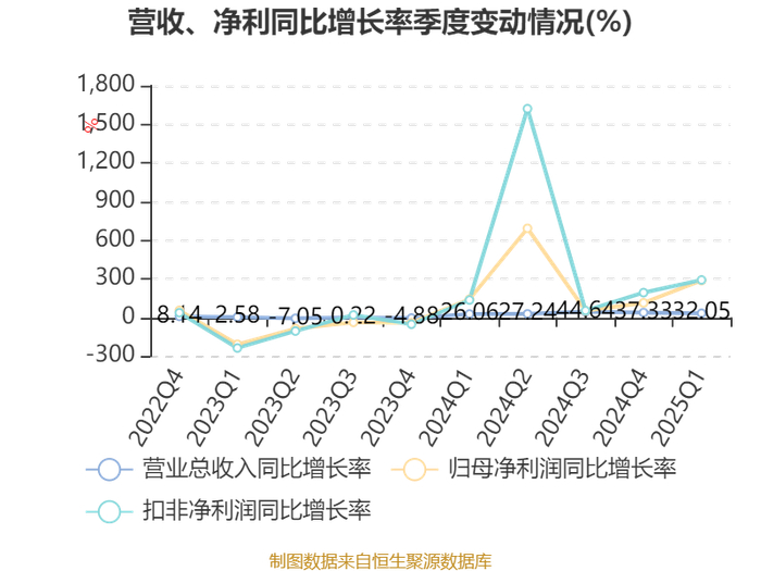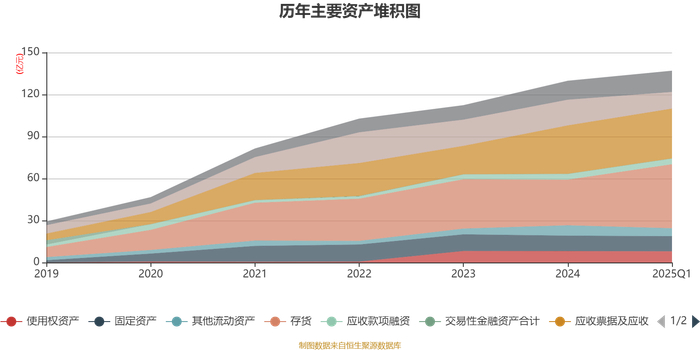资产重大变化方面,截至2025年一季度末,公司存货较上年末增加40.16%,占公司总资产比重上升8.25个百分点;货币资金较上年末减少35.27%,占公司总资产比重下降5.47个百分点;其他流动资产较上年末减少22.69%,占公司总资产比重下降1.51个百分点;应收票据及应收账款较上年末增加2.77%,占公司总资产比重下降0.69个百分点。