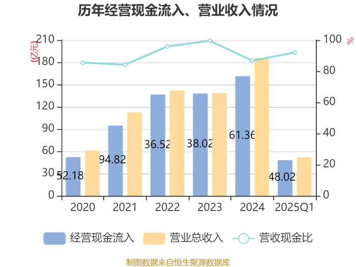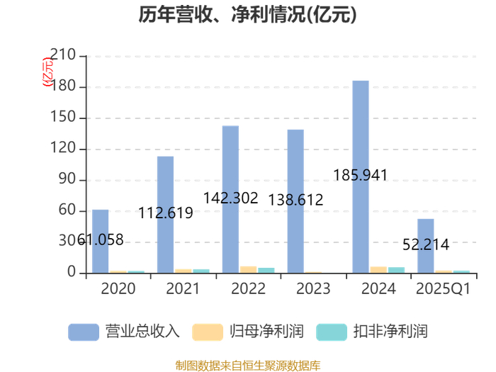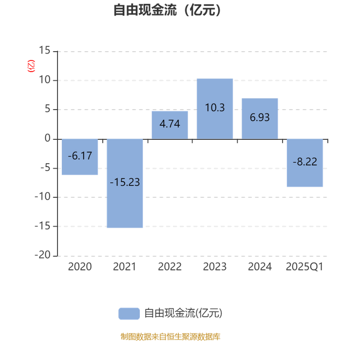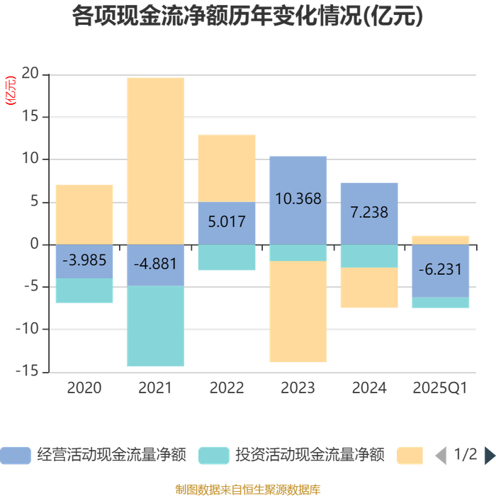 截至2025年一季度末,公司经营活动现金流净额为-6.23亿元,同比增加8587.79万元;筹资活动现金流净额1亿元,同比减少2.62亿元;投资活动现金流净额-1.24亿元,上年同期为-2052.97万元。