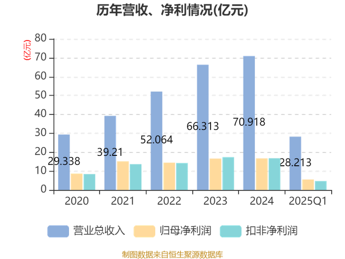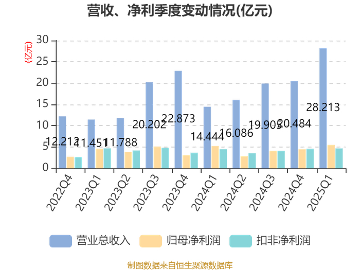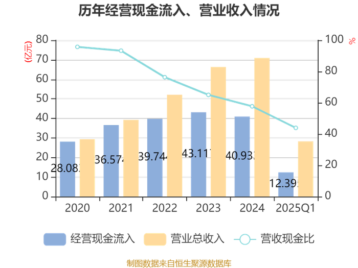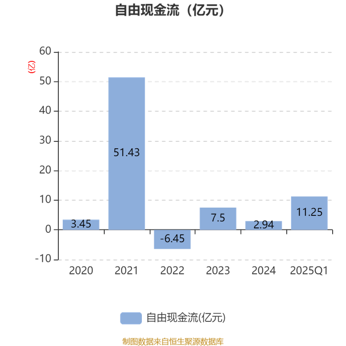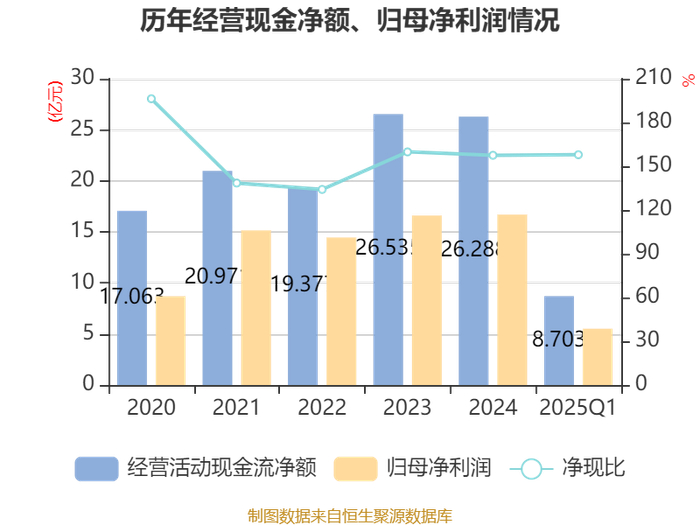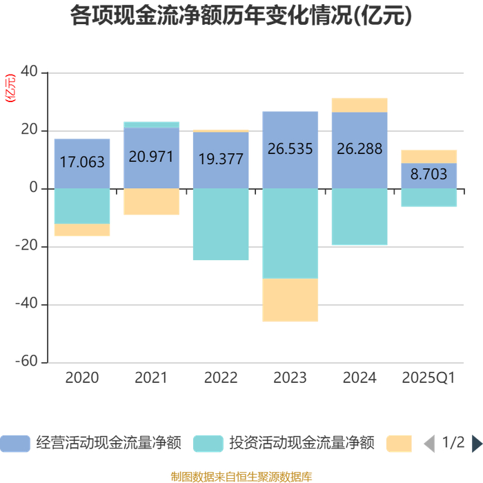 截至2025年一季度末,公司经营活动现金流净额为8.7亿元,同比增长10.17%;筹资活动现金流净额4.53亿元,同比增加2.28亿元;投资活动现金流净额-6.33亿元,上年同期为-1.39亿元。