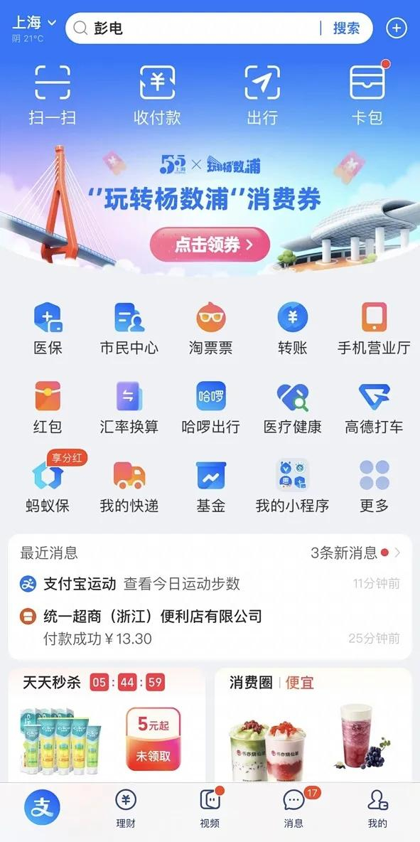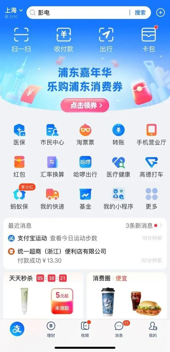 方式一:用户在消费券发放时间点打开支付宝,如在支付宝首页看到活动入口,点击即可进入活动页面。