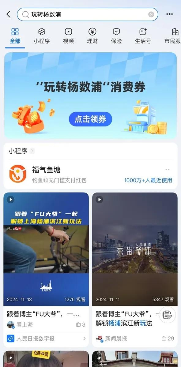☛【方式二】用户打开支付宝,在支付宝首页搜索框搜索“玩转杨数浦”即可进入活动页面。