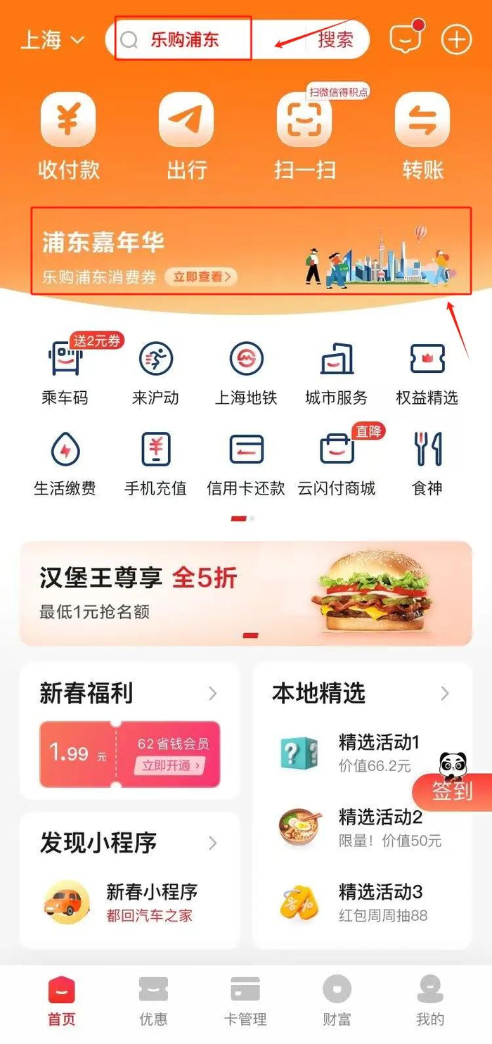 方式二:用户打开云闪付,在云闪付首页搜索框搜索"乐购浦东"即可进入活动页面。