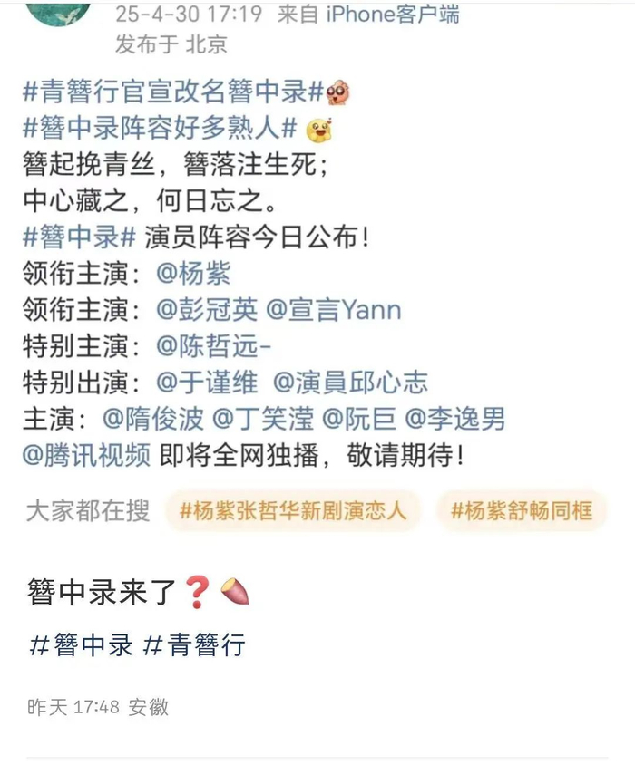 “《簪中录》来了?”“《青簪行》终于要播出了吗?”4月30日,《青簪行》疑似要改名播出的消息引发网友热议,其消息来源于一个名为“影视剧簪中录”的账号,该账号于30日傍晚发文称“青簪行官宣改名簪中录”,并官宣演员阵容,同时称即将在腾讯视频全网独播,和常规的网剧官宣模式并无太大分别。
