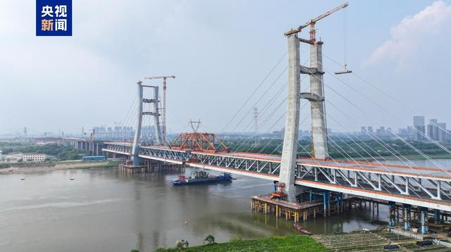 昌九高铁扬子洲赣江公铁大桥位于南昌市境内,全长19公里,由北向南跨越赣江西支、中支和南支三条支流,是一座集高速铁路、城市快速路、城市主干道三种交通方式于一体的大跨度公路铁路合建桥梁。此次吊装完成的西支主桥是全线控制性工程,采用“竖琴型索面钢箱桁组合梁斜拉桥”设计,主跨320米,全长702米,共45个钢箱桁梁节段,单节最重达到958吨,全桥钢箱桁梁总重约为3.41万吨,相当于81辆高速列车的重量之和,规模与施工难度均居国内同类桥梁前列。