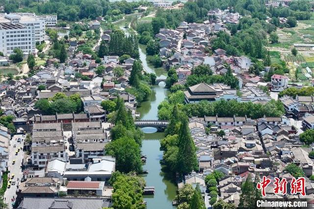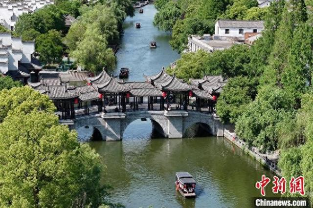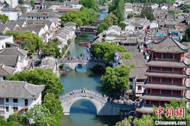 5月1日,“五一”假期首日,安徽省合肥市肥西县国家5A级景区三河古镇景区古意盎然,吸引众多游客前来参观游览。图为江淮民居和穿城而过的小河互相映衬,美景如画。(无人机照片)中新社记者 韩苏原 摄