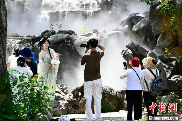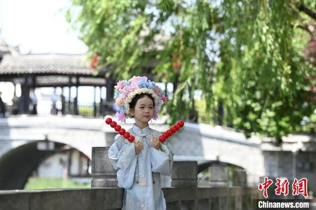 5月1日,“五一”假期首日,安徽省合肥市肥西县国家5A级景区三河古镇景区古意盎然,吸引众多游客前来参观游览。图为游客身穿汉服在景区内打卡拍照。中新社记者 韩苏原 摄