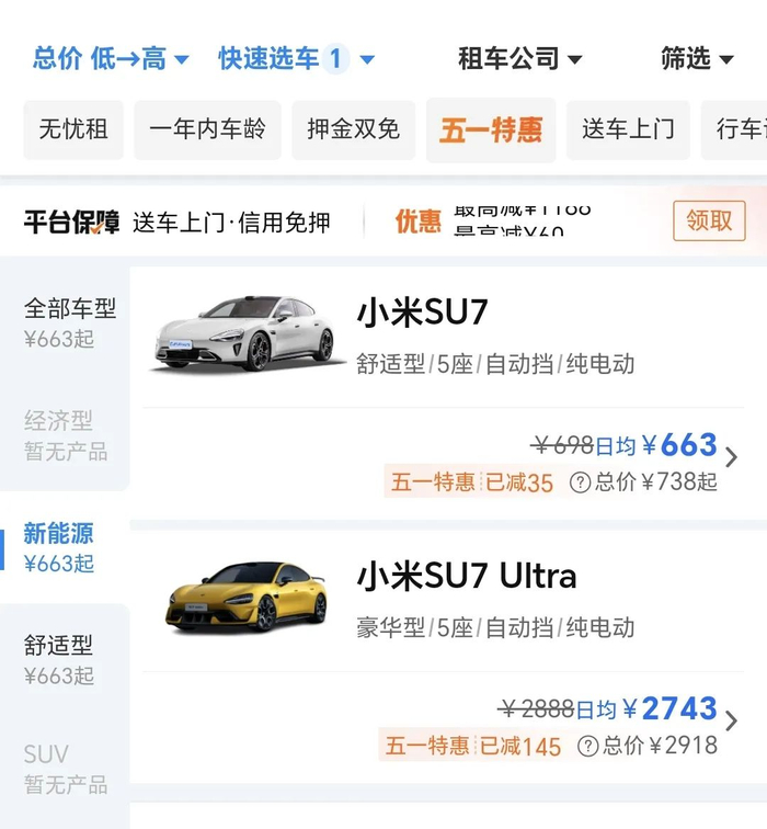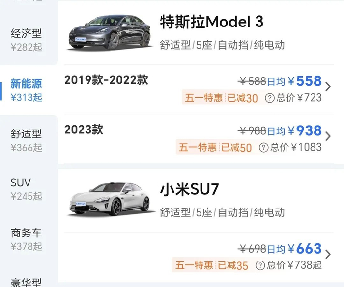 例如,网红车型小米 SU7 Ultra的日均租金已超出2000元,特斯拉Model Y(25款)日租金则在600元左右。