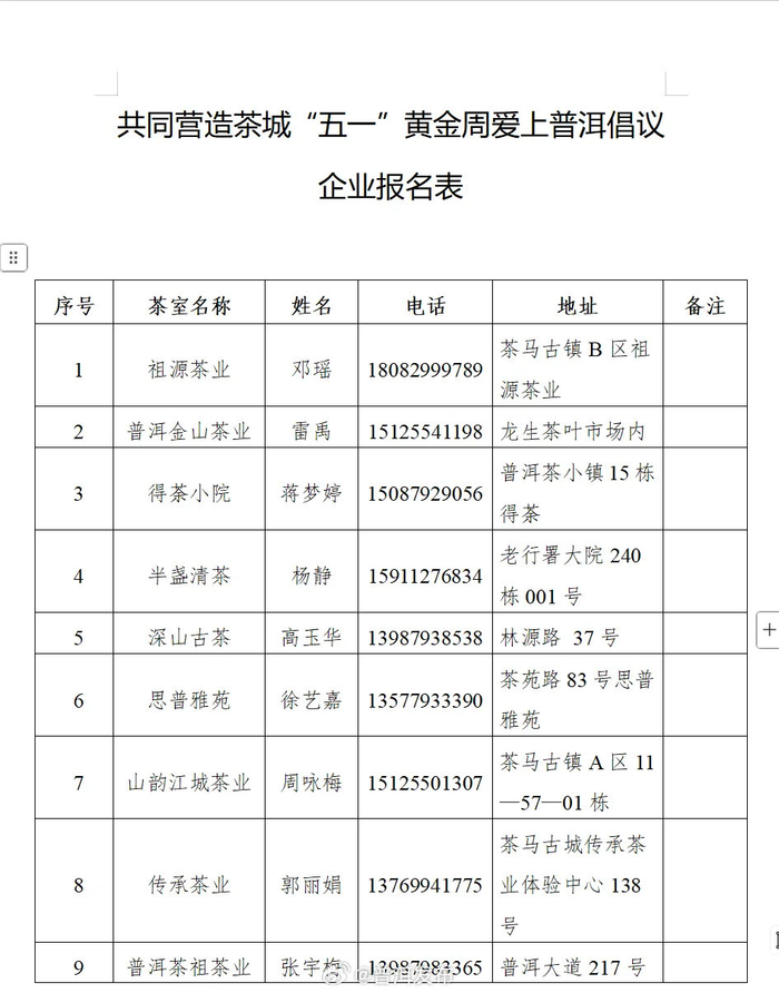 “五一”假期期间为打造世界的普洱、中国的茶,共筑茶城旅游氛围,近日,普洱茶协会发出《共同营造茶城“五一”黄金周爱上普洱倡议》,诚邀各会员企业、茶店、不歇茶室以茶的纯香、咖啡的甜美吸引更多人爱上普洱。不少茶企业积极响应,现将《共同营造茶城“五一”黄金周爱上普洱倡议企业报名表》公示如下,欢迎八方来客入店免费品饮!详见:网页链接