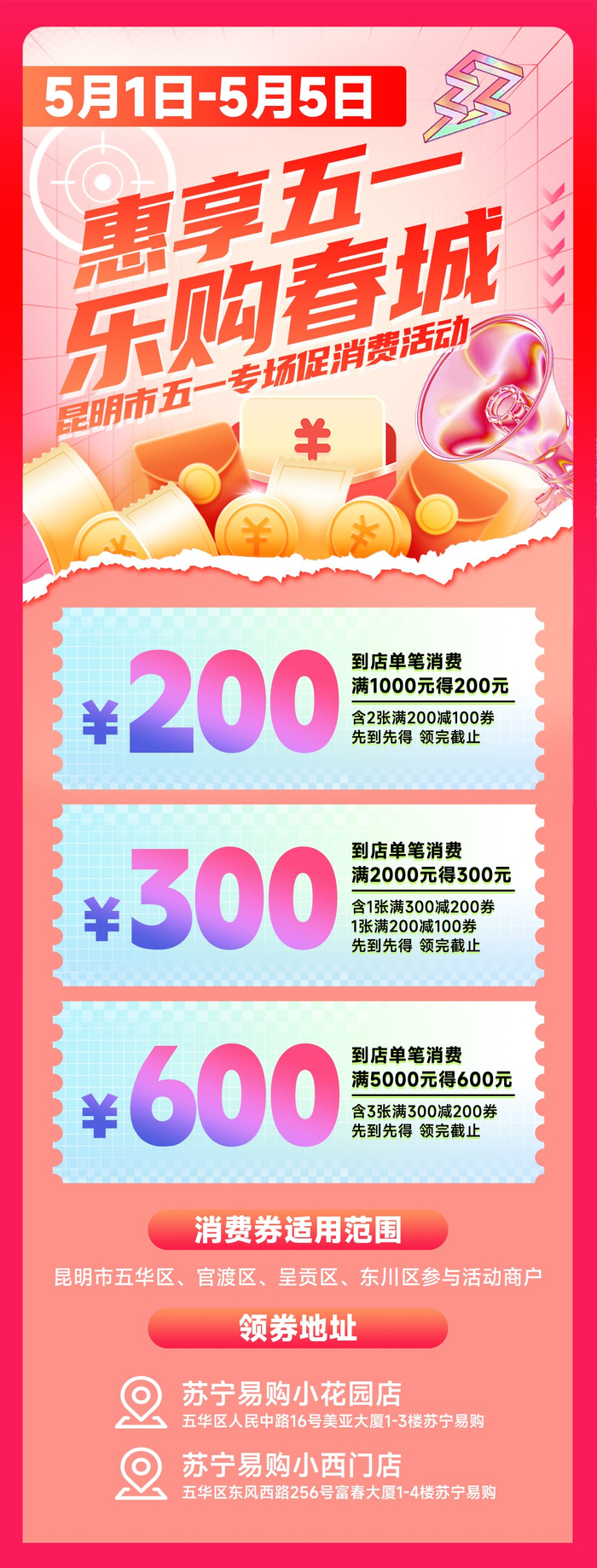 云南网讯(记者 杨萍)为充分激活假日经济,推动消费提质扩容,昆明市将于5月1日至5月5日在五华区、官渡区、呈贡区、东川区开展“惠享五一,乐购春城”为主题的五一专场促消费活动——针对单笔消费金额达到一定额度的个人消费者,发放总额为300万元的购物消费券。其中,苏宁易购小花园店、小西门店被列为重点配券商户。