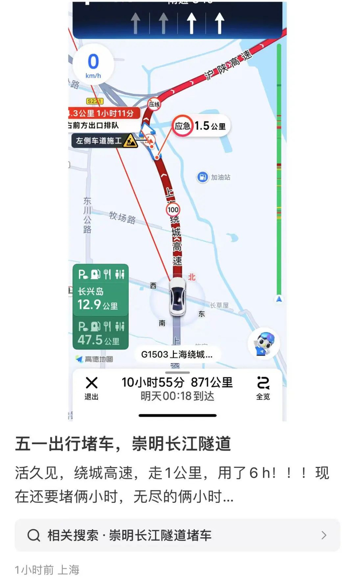 5月1日10时,据浦东警方高东收费站指挥点实时信息,出城的车流沿五洲大道已缓行至杨高北路附近,实时车流量约为每小时3500辆,车速保持在每小时30公里左右。