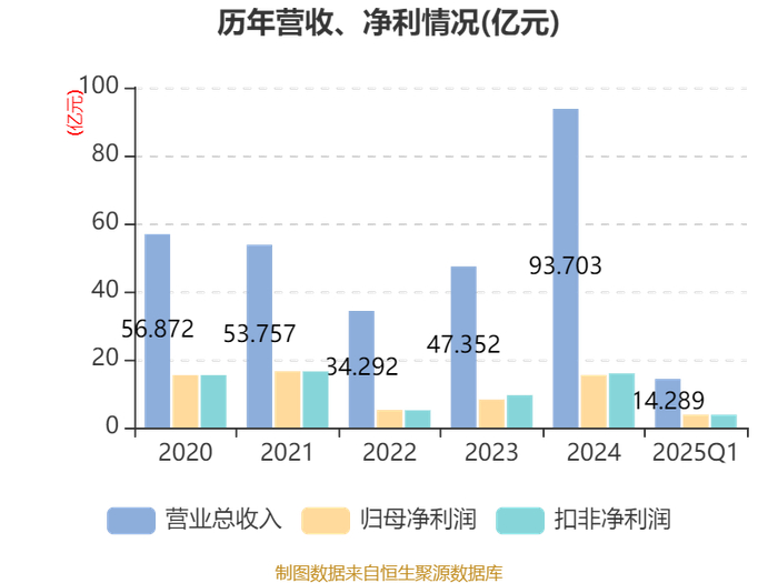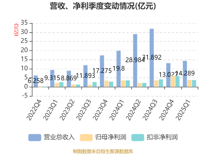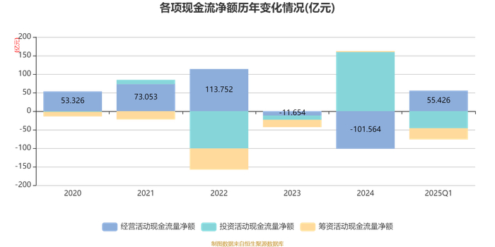 截至2025年一季度末,公司经营活动现金流净额为55.43亿元,同比增加108.27亿元;筹资活动现金流净额-30.38亿元,同比减少18.88亿元;投资活动现金流净额-45.97亿元,上年同期为76.75亿元。