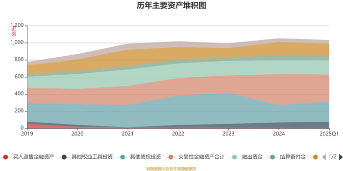 资产重大变化方面,截至2025年一季度末,公司交易性金融资产合计较上年末减少13.09%,占公司总资产比重下降3.9个百分点;其他债权投资较上年末增加17.94%,占公司总资产比重上升3.9个百分点;结算备付金较上年末减少23.12%,占公司总资产比重下降1.19个百分点;其他权益工具投资较上年末增加14.2%,占公司总资产比重上升1.02个百分点。