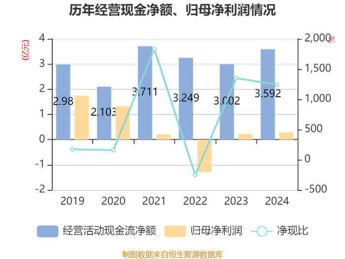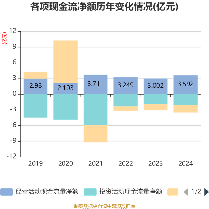 截至2024年,公司经营活动现金流净额为3.59亿元,同比增长19.65%;筹资活动现金流净额-1.42亿元,同比减少1334.31万元;投资活动现金流净额-2.1亿元,上年同期为-1.86亿元。