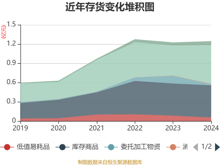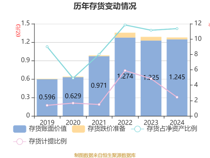 从存货变动来看,截至2024年末,公司存货账面价值为1.24亿元,占净资产的11.36%,较上年末增加196.94万元。其中,存货跌价准备为309.79万元,计提比例为2.43%。