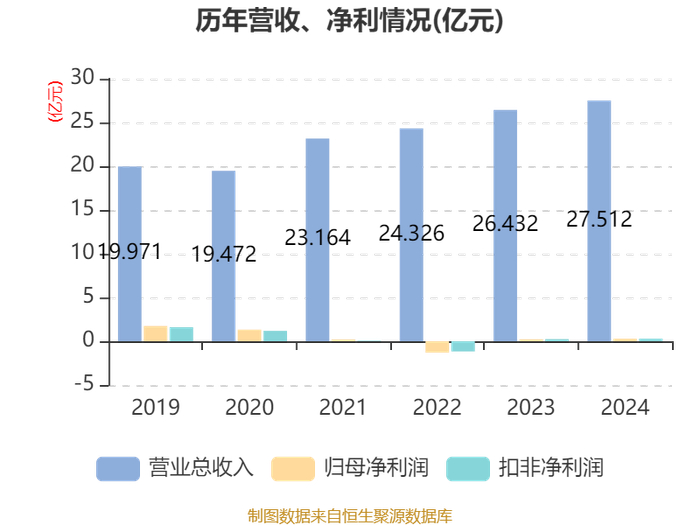 中证智能财讯一鸣食品(605179)4月30日披露2024年年度报告。2024年,公司实现营业总收入27.51亿元,同比增长4.09%;归母净利润2894.38万元,同比增长30.16%;扣非净利润2921.9万元,同比增长21.77%;经营活动产生的现金流量净额为3.59亿元,同比增长19.65%;报告期内,一鸣食品基本每股收益为0.0722元,加权平均净资产收益率为2.63%。公司2024年度分配预案为:拟向全体股东每10股派现0.15元(含税)。