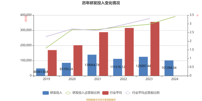 2024年全年,公司研发投入金额为10.14亿元,同比下降18.95%;研发投入占营业收入比例为3.42%,相比上年同期上升0.45个百分点。此外,公司全年研发投入资本化率为0%。