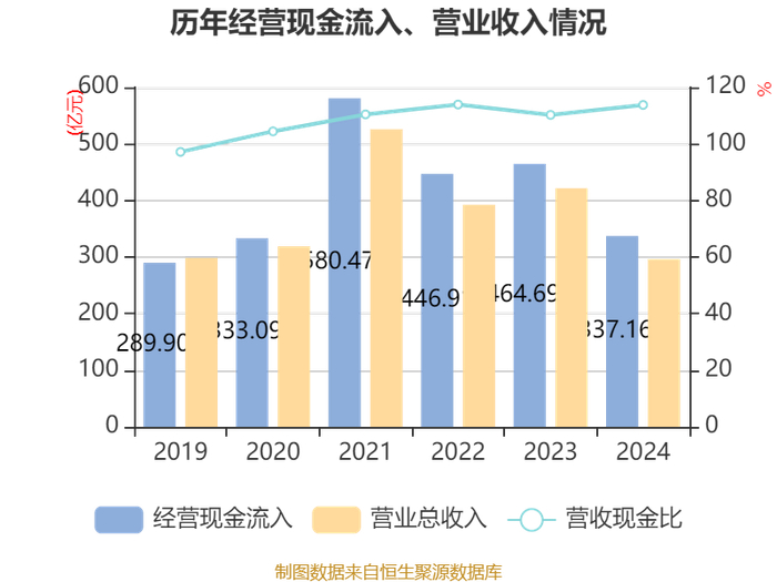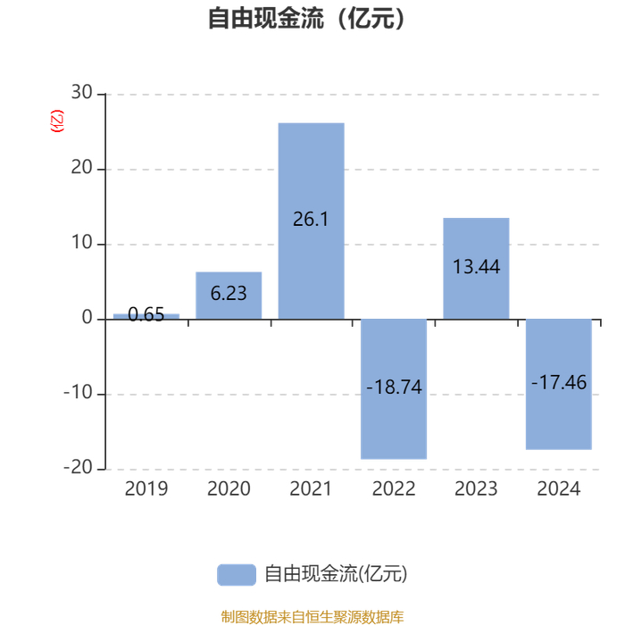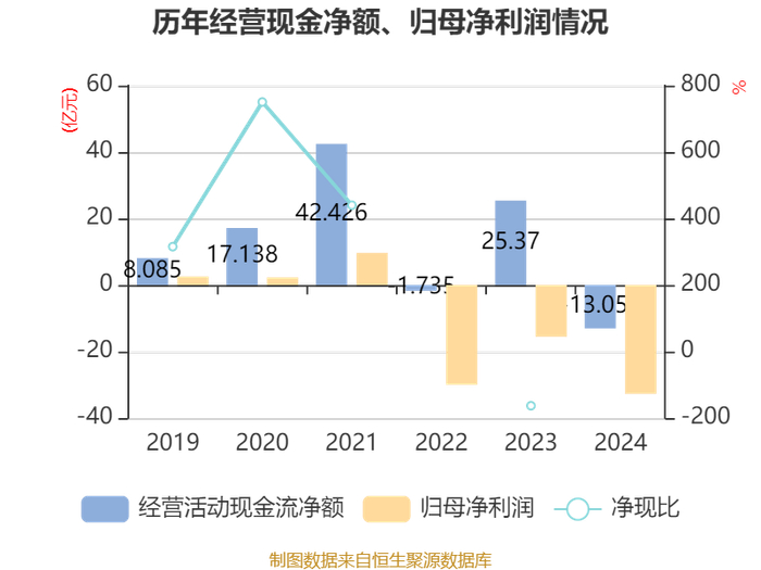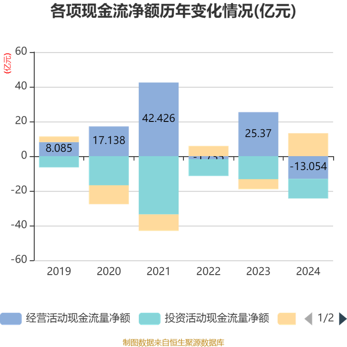 截至2024年,公司经营活动现金流净额为-13.05亿元,同比减少38.42亿元;筹资活动现金流净额13.19亿元,同比增加18.99亿元;投资活动现金流净额-11.32亿元,上年同期为-13.25亿元。