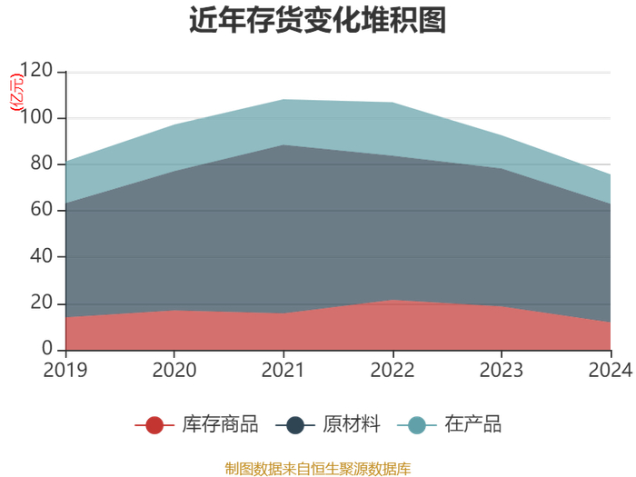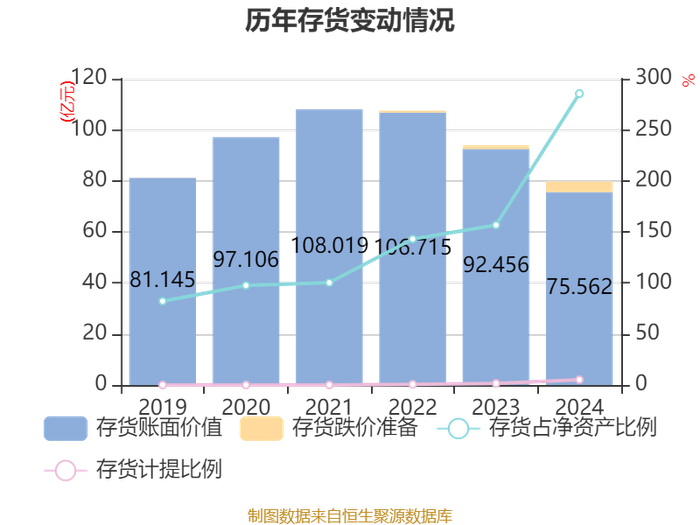 从存货变动来看,截至2024年末,公司存货账面价值为75.56亿元,占净资产的285.43%,较上年末减少16.89亿元。其中,存货跌价准备为4.12亿元,计提比例为5.17%。