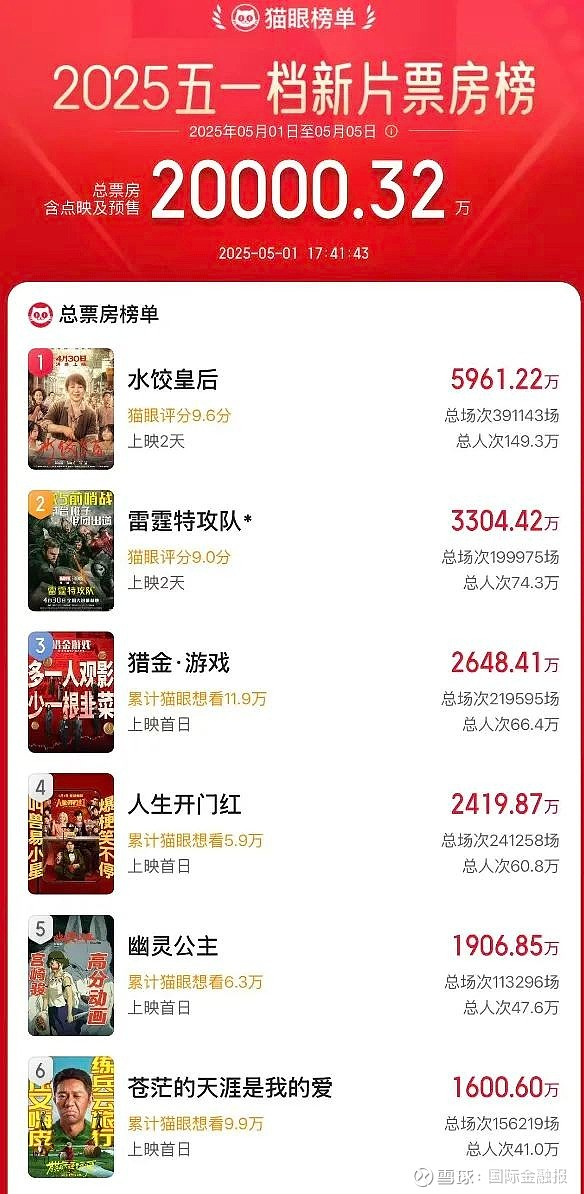 电影市场也迎来“开门红”,据猫眼专业版数据,截至5月1日13时47分,2025年五一劳动节票房破亿,《水饺皇后》领跑劳动节票房榜。