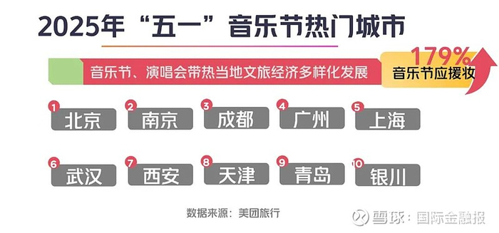 据美团旅行数据,“五一”音乐节Top10的热门城市为:北京、南京、成都、广州、上海、武汉、西安、天津、青岛、银川。此外,受演唱会、音乐节带动,宝鸡、常州、滁州、孝感、阜阳、伊宁成为“五一”热门小城。