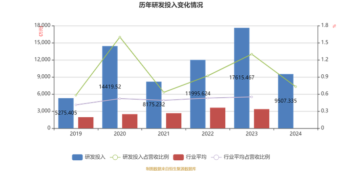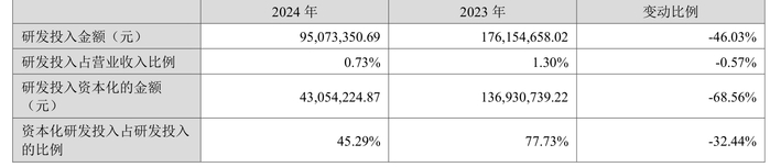 2024年全年,公司研发投入金额为9507.34万元,同比下降46.03%;研发投入占营业收入比例为0.73%,相比上年同期下降0.57个百分点。此外,公司全年研发投入资本化率为45.29%。