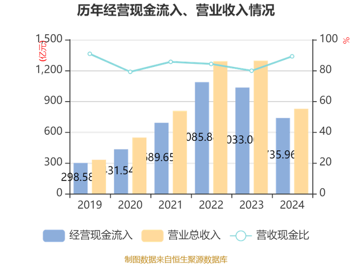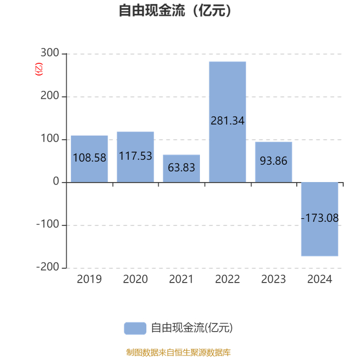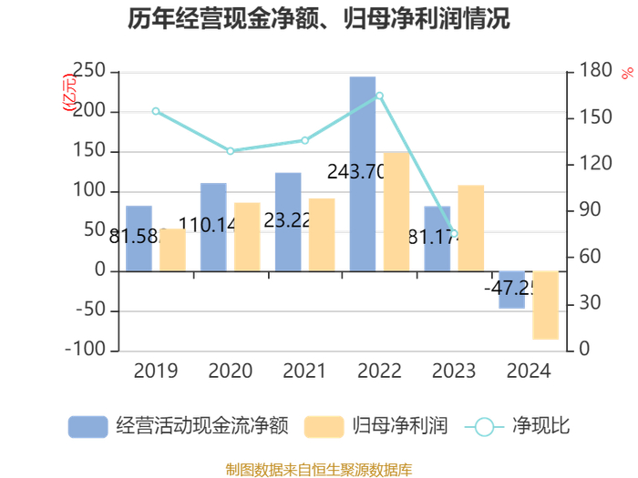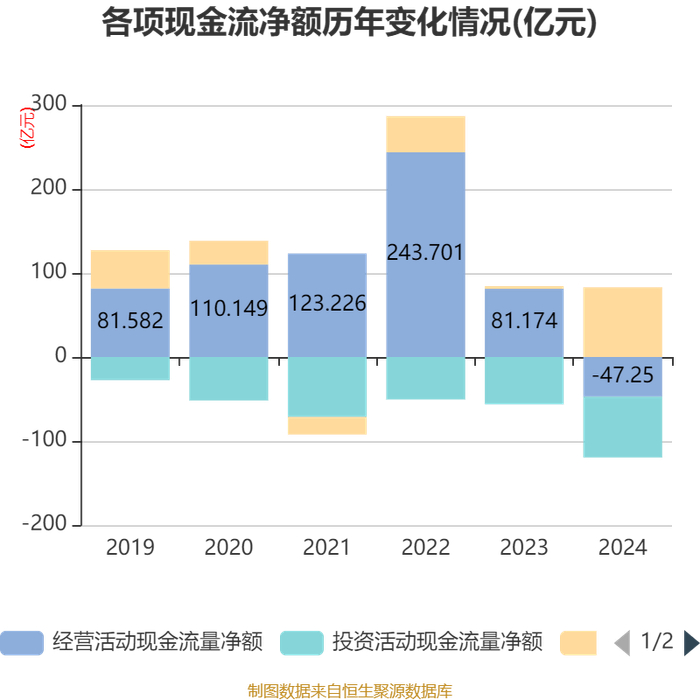 截至2024年,公司经营活动现金流净额为-47.25亿元,同比减少128.42亿元;筹资活动现金流净额82.97亿元,同比增加79.82亿元;投资活动现金流净额-72.32亿元,上年同期为-56.36亿元。