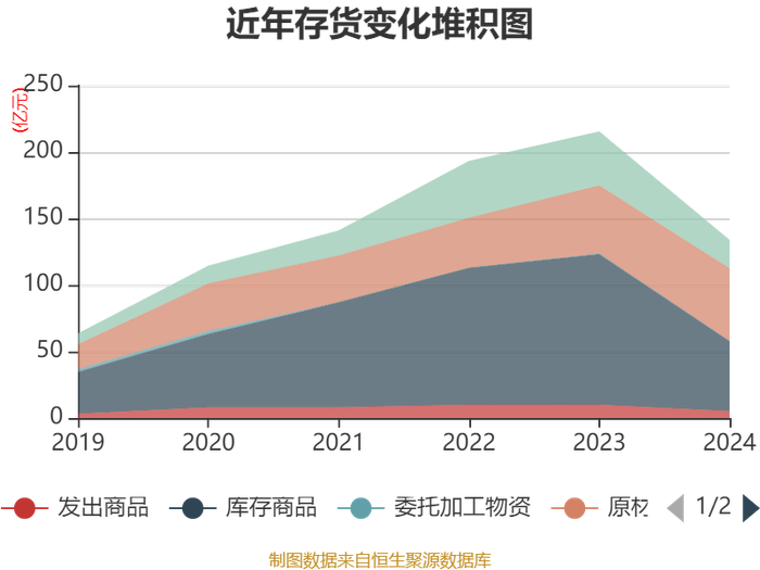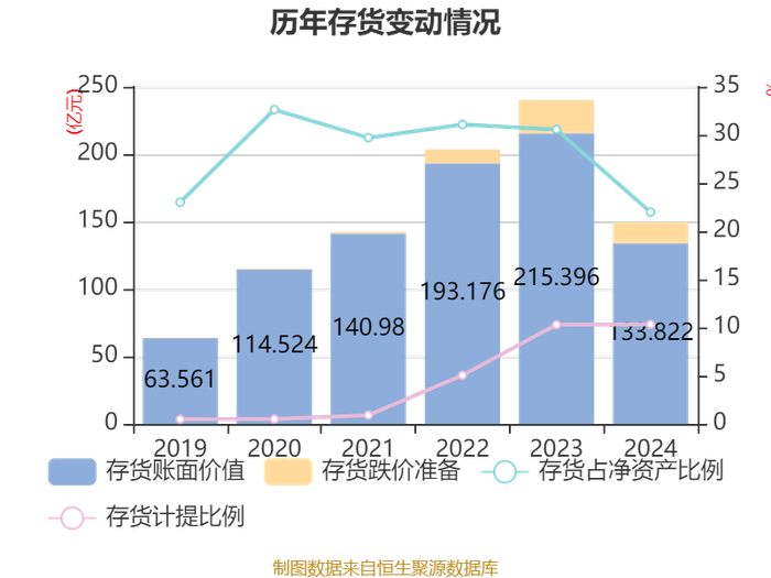 从存货变动来看,截至2024年末,公司存货账面价值为133.82亿元,占净资产的21.98%,较上年末减少81.57亿元。其中,存货跌价准备为15.42亿元,计提比例为10.33%。