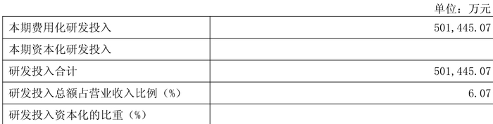 2024年全年,公司研发投入金额为50.14亿元,同比下降35.05%;研发投入占营业收入比例为6.07%,相比上年同期上升0.11个百分点。此外,公司全年研发投入资本化率为0%。