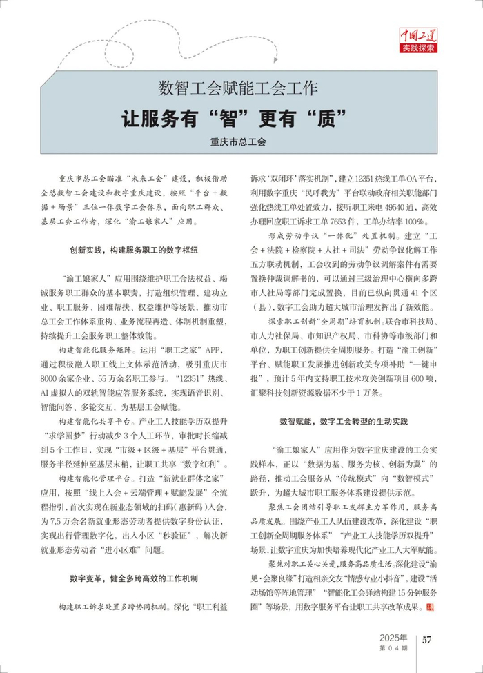 重庆市总工会瞄准“未来工会”建设,积极借助全总数智工会建设和数字重庆建设,按照“平台+数据+场景”三位一体数字工会体系,面向职工群众、基层工会工作者,深化“渝工娘家人”应用。