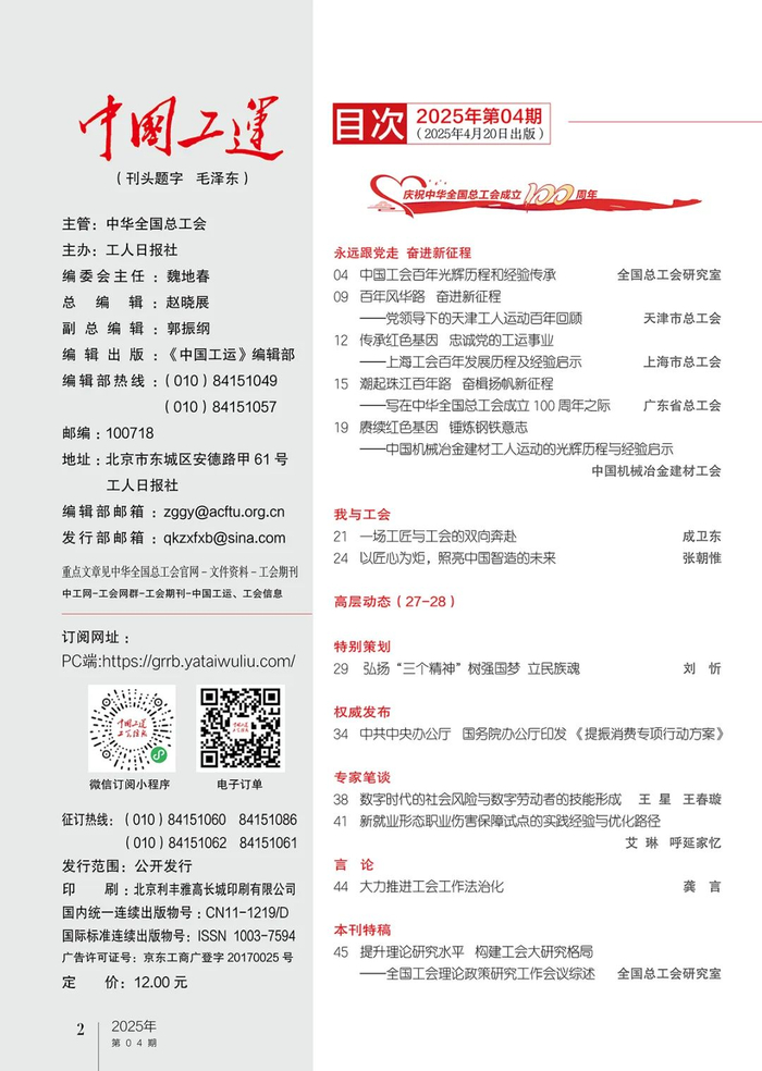 2025年是中华全国总工会成立100周年。一百年前,中国共产党发起的第二次全国劳动大会在广州召开,中华全国总工会正式宣告成立。这是中国工人运动史上的一件大事,标志着中国工会实现了政治上、组织上的团结统一,标志着我们党对工人运动的领导进一步加强。一百年来,中华全国总工会及其领导的各工会组织紧紧团结在中国共产党周围,组织动员工人阶级和广大劳动群众围绕党在各个历史时期的中心任务,奋勇拼搏、建功立业,为争取民族独立、人民解放和实现国家富强、人民幸福贡献了力量。回顾总结中国工会走过的百年光辉历程、形成的宝贵经验,对于深刻领悟“两个确立”的决定性意义,不断增强“四个意识”、坚定“四个自信”、做到“两个维护”,在新的历史起点上推动党的工运事业和工会工作创新发展,团结动员亿万职工在强国建设、民族复兴中发挥主力军作用,具有重大而深远的意义。