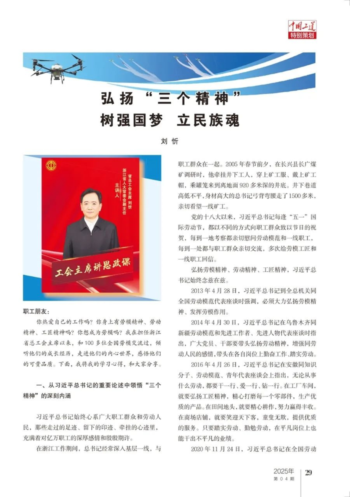 浙江省人大常委会副主任、省总工会主席刘忻同志和100多位全国劳模交流过,倾听过他们的成长经历,走进过他们的内心世界,深刻感悟到他们的可贵品质和宝贵经验。他从习近平总书记的重要论述中领悟到“三个精神”的深刻内涵、不同时期的劳模故事中感悟了“三个精神”的时代伟力、劳模的成长经历中参悟出成为劳模的要素和秘诀,并把这些故事和心得分享给广大的职工朋友,进行了一场生动、富有内涵的“工会主席讲思政课”。